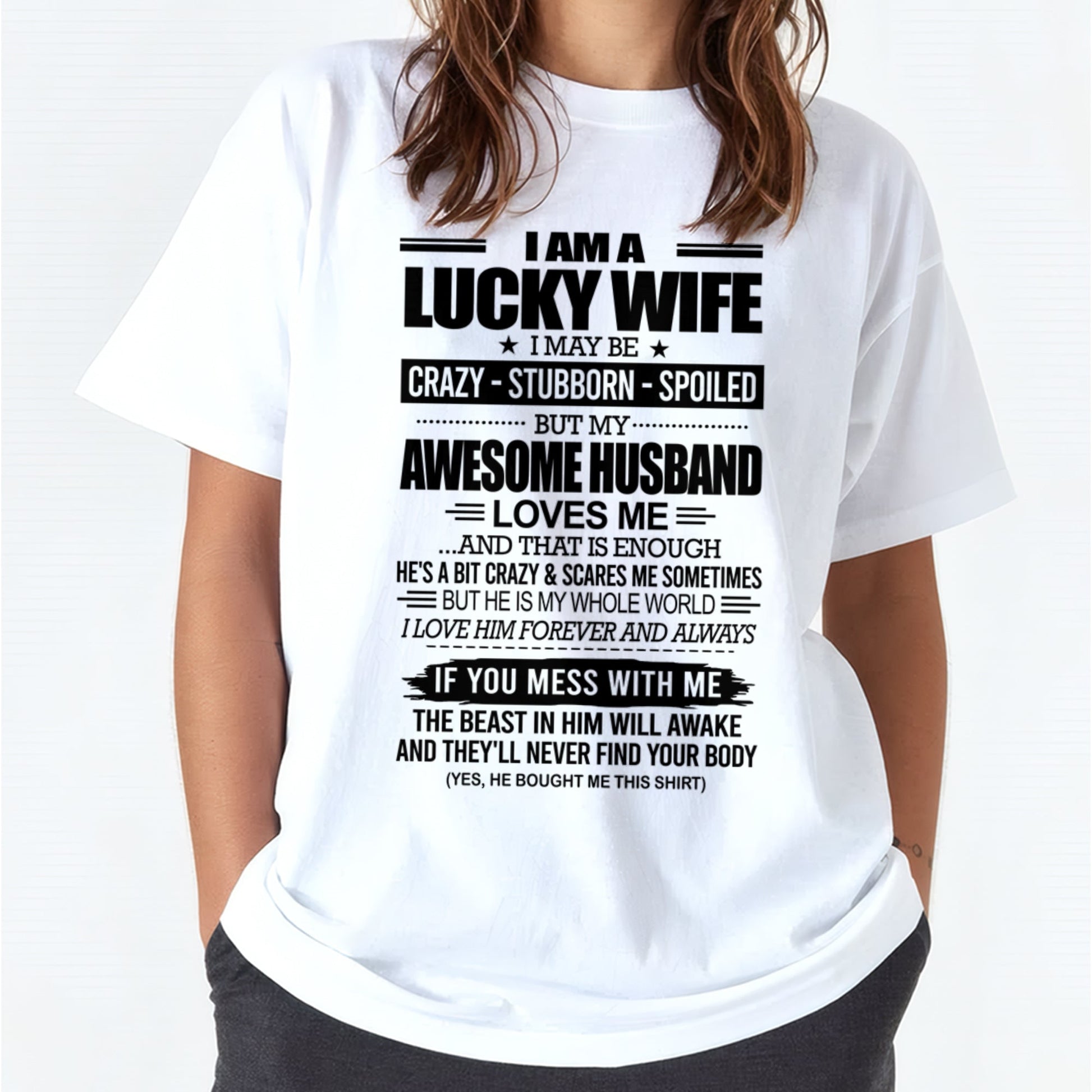 I AM A LUCKY WIFE I MAY BE CRAZY - STUBBORN - SPOILED T-Shirt – Birthday Gift From Husband / Man - snow00 (SKU12-297-00)